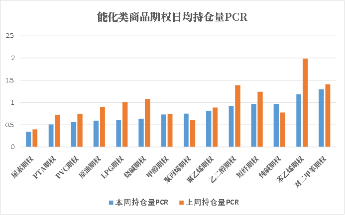 市场情绪方面:本周日均持仓量PCR指标中,能化类商品期权指标涨跌不一,市场多空情绪分化明显。尿素期权本周持仓量PCR数值为0.34,市场短期看空情绪较强;对二甲苯期权本周持仓量PCR数值为1.30,市场短期看多情绪较强;