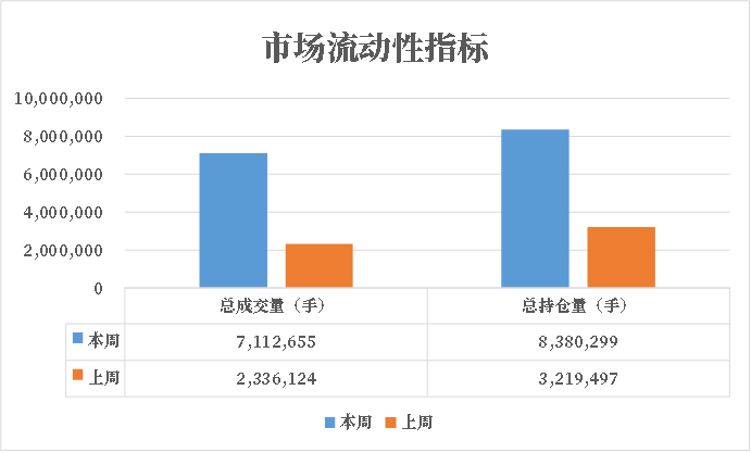 商品期权市场总持仓量:本周主力商品期权合约持仓量约为8,380,299手,相比上周3,219,497手,上涨160.30%。
