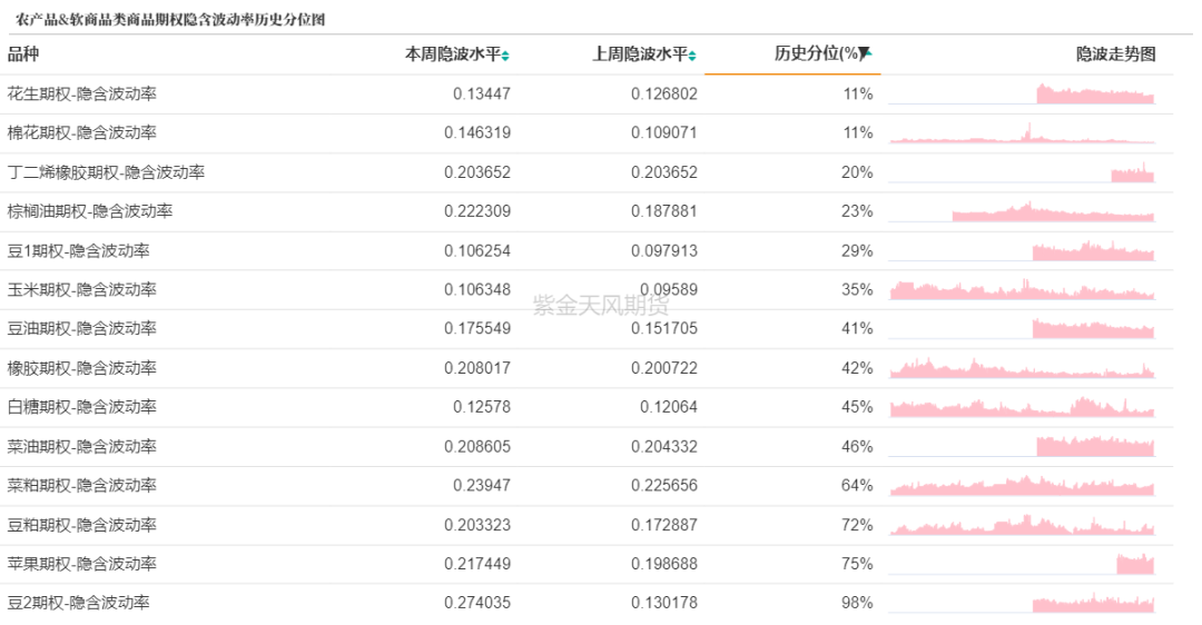 隐含波动率回顾:本周农产品&软商品类商品期权各个品种主力合约隐含波动率,大多处于较低历史区间。