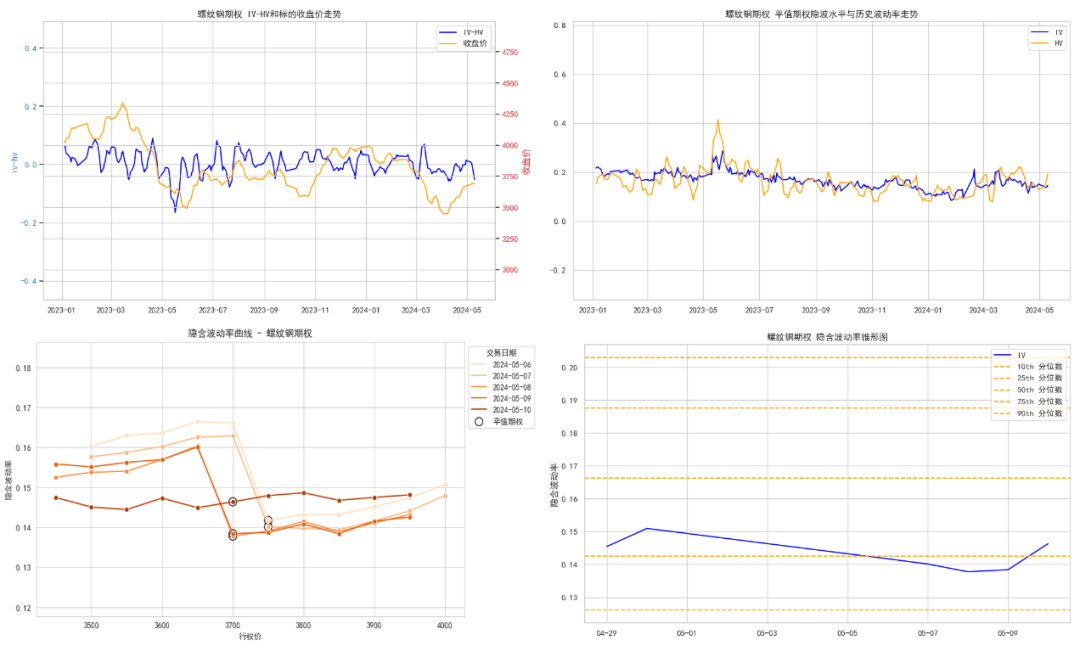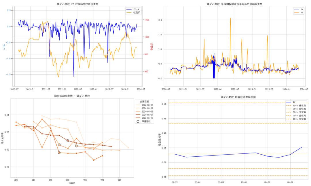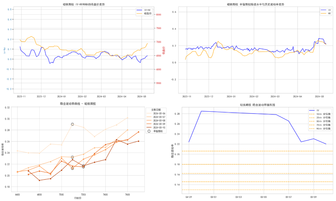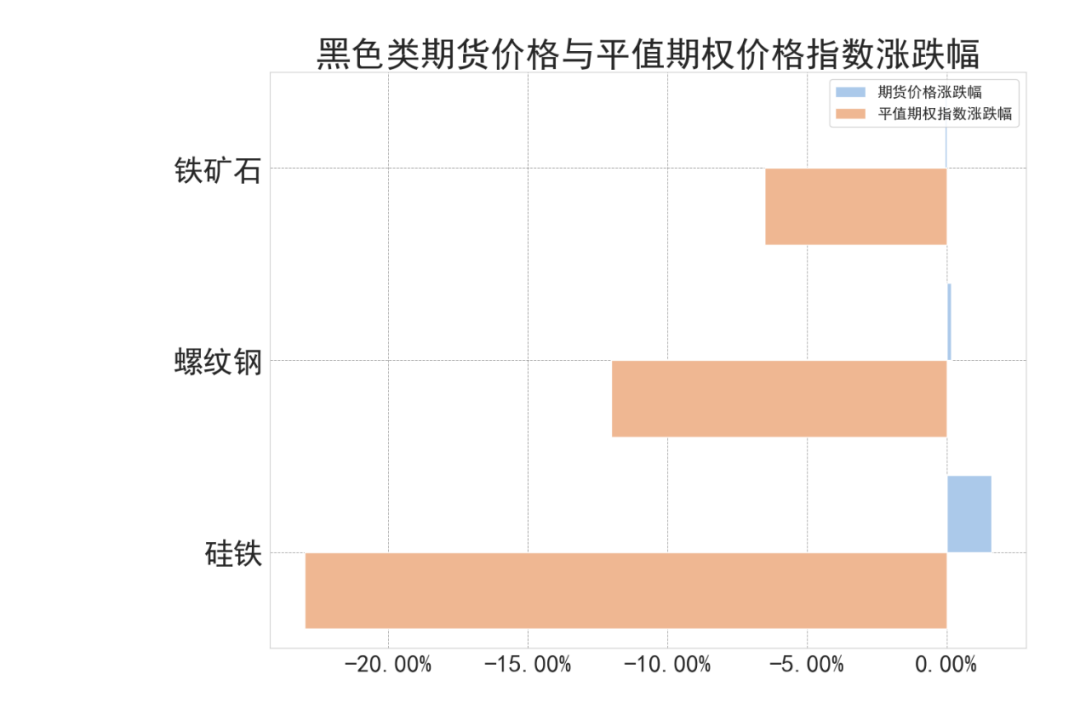 标的价格&平值期权价格指数:黑色类期货价格波动不一,硅铁涨幅为:1.61%,螺纹钢涨幅为:0.16%。铁矿石跌幅为:0.06%。平值期权价格指数方面,铁矿石较上周有较大跌幅,跌幅为:6.51%,螺纹钢较上周有较大跌幅,跌幅为:12.02%;