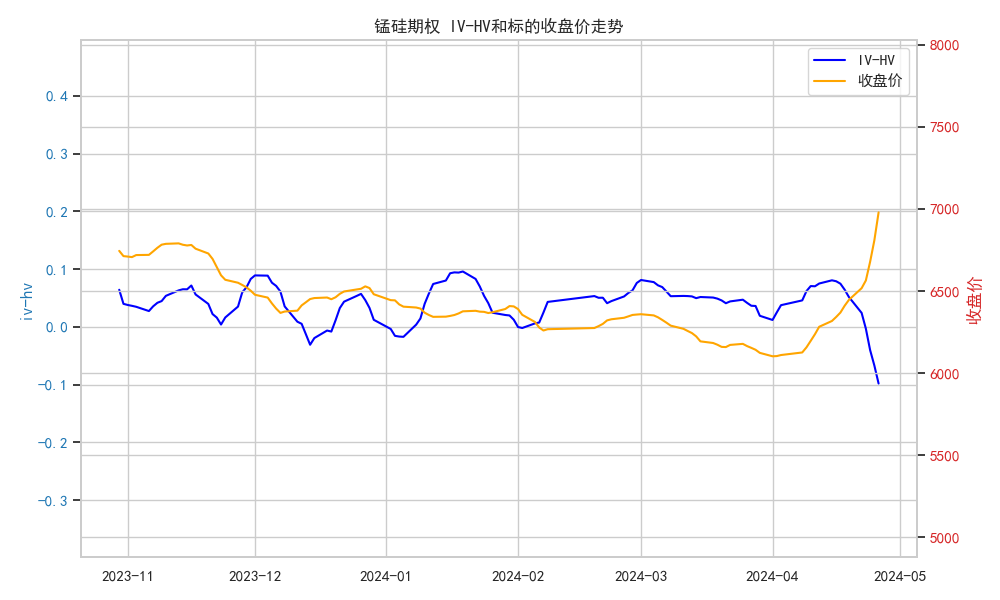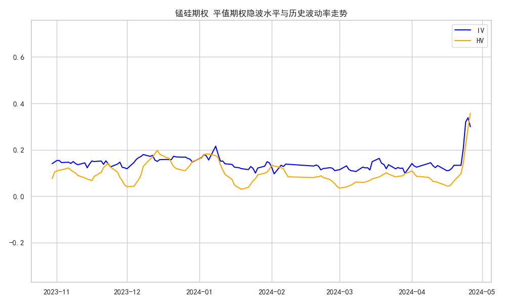 锰硅期权历史波动率(HV)与隐含波动率(IV)的差值为0.13,历史波动率(HV)显著大于隐含波动率(IV)。根据IV-HV差值回归模型,后续可以关注差值情况并选择在合适的IV或HV值进行套利交易。