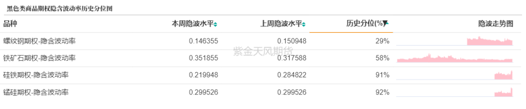 隐含波动率回顾:本周黑色类商品期权各个品种主力合约隐含波动率,大多处于较高历史区间。