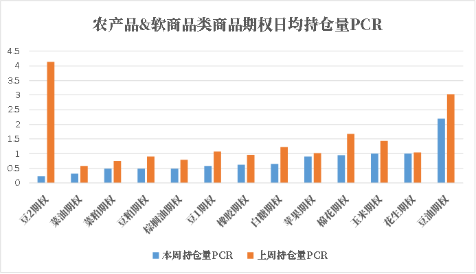 市场情绪方面:本周日均持仓量PCR指标中,农产品&软商品商品期权指标均有不同程度下跌。豆2期权本周持仓量PCR数值为0.22,市场短期看空情绪强烈;豆油期权本周持仓量PCR数值为2.19,市场短期看多情绪强烈;