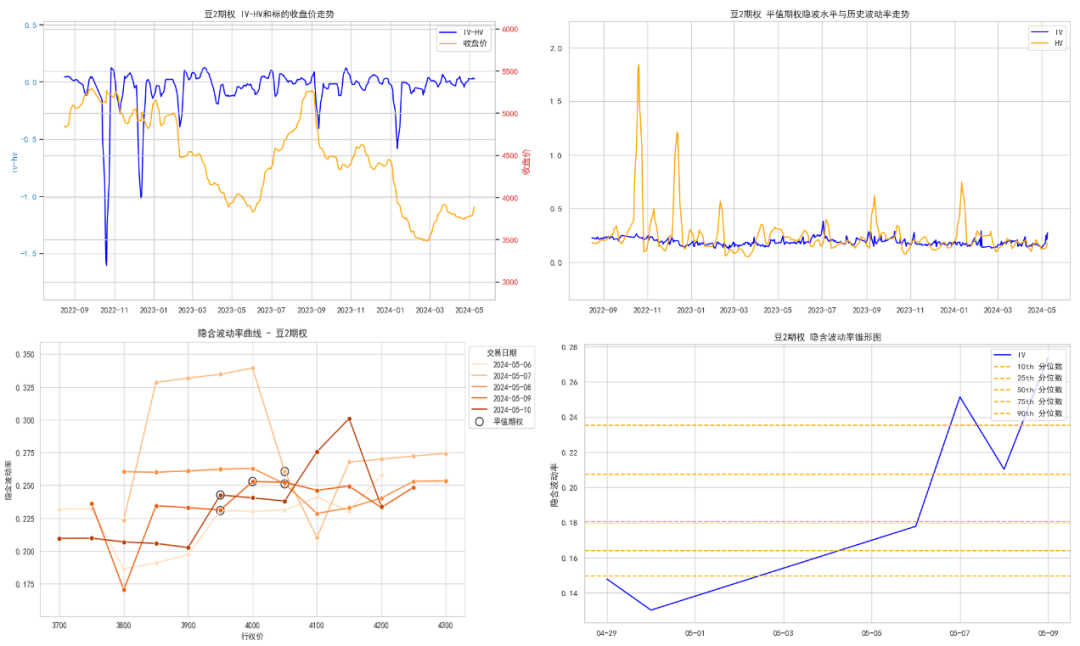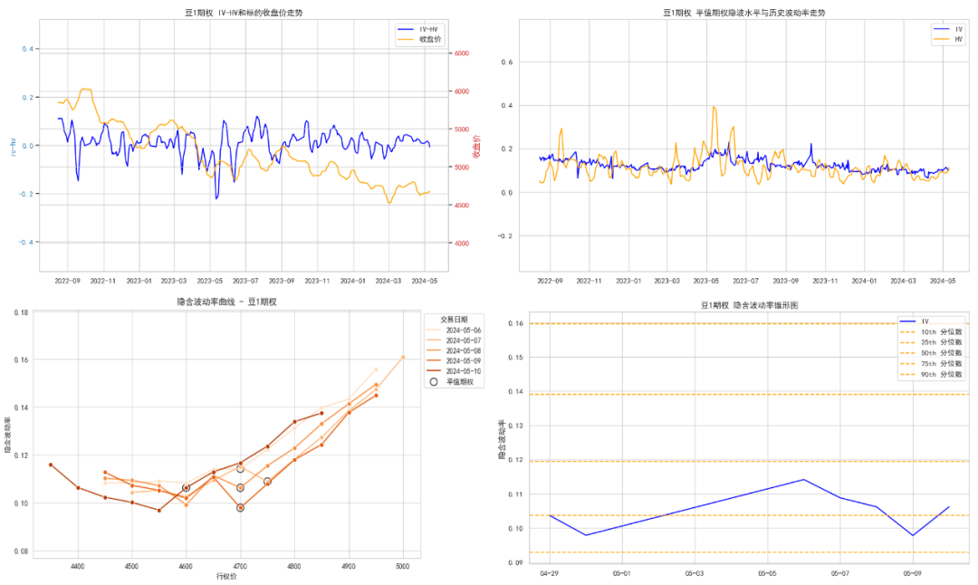 农产品&软商品类商品期权:本周农产品&软商品类商品期权各个品种主力合约隐含波动率,大多处于较低历史区间。花生期权隐含波动率历史分位数为11%,棉花期权隐含波动率历史分位数为11%,棕榈油期权隐含波动率历史分位数为27%,豆1期权隐含波动率历史分位数为29%,处于较低历史区间;豆粕期权隐含波动率历史分位数为75%,苹果期权隐含波动率历史分位数为75%,豆2期权隐含波动率历史分位数为98%,处于较高历史区间。根据波动率均值回归角度判断,可以关注隐含波动率后续向历史均值的回归。