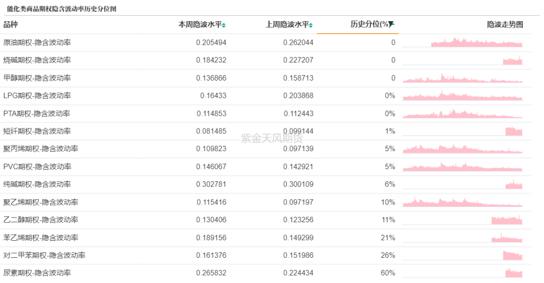 隐含波动率回顾:本周能化类商品期权各个品种主力合约隐含波动率,大多处于较低历史区间。其中甲醇期权,烧碱期权,原油期权,LPG期权,PTA期权隐含波动率为历史新低。