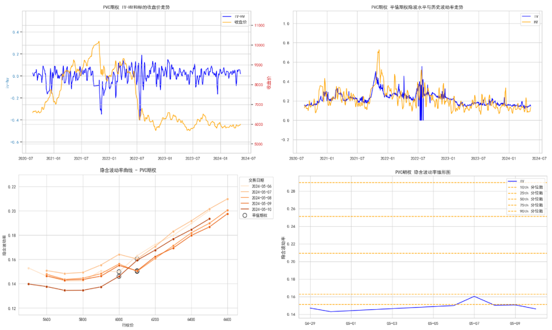 标的价格&平值期权价格指数:能化类期货价格波动不一,尿素涨幅为:1.46%,PVC涨幅为:1.05%。纯碱跌幅为:0.18%,甲醇跌幅为:0.23%。平值期权价格指数方面,尿素较上周有较大涨幅,涨幅为:13.37%,PVC较上周有较大涨幅,涨幅为:9.24%纯碱跌幅为:4.68%,甲醇较上周有较大跌幅,跌幅为:8.97%;