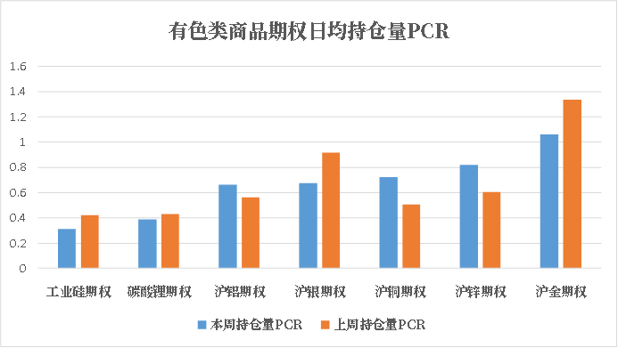 有色类商品:本周日均持仓量PCR指标中,有色类商品期权指标涨跌不一,市场多空情绪分化明显。工业硅期权本周持仓量PCR数值为0.31,碳酸锂期权本周持仓量PCR数值为0.39,沪铝期权本周持仓量PCR数值为0.66,沪银期权本周持仓量PCR数值为0.68,市场短期看空情绪较强;沪铜期权本周持仓量PCR数值为0.72,沪锌期权本周持仓量PCR数值为0.82,沪金期权本周持仓量PCR数值为1.06,期货价格可能出现短期震荡局面。