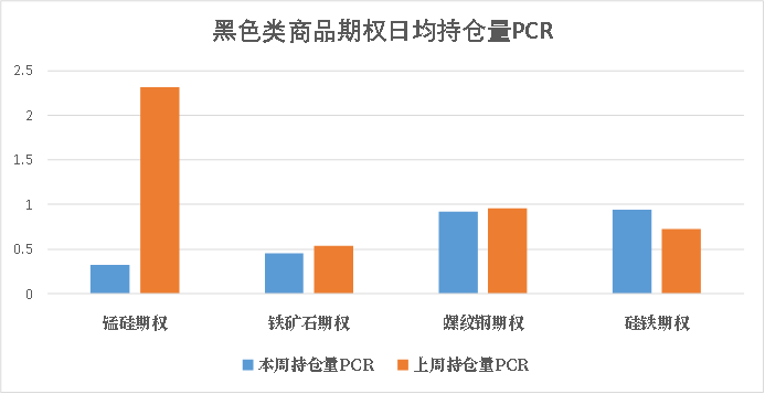 黑色类商品期权:本周日均持仓量PCR指标中,黑色类商品期权指标涨跌不一,市场多空情绪分化明显。锰硅期权本周持仓量PCR数值为0.32,铁矿石期权本周持仓量PCR数值为0.45,市场短期看空情绪较强;螺纹钢期权本周持仓量PCR数值为0.92,硅铁期权本周持仓量PCR数值为0.94,期货价格可能出现短期震荡局面。未来短期黑色类商品期货价格可能出现短期震荡向下局面。
