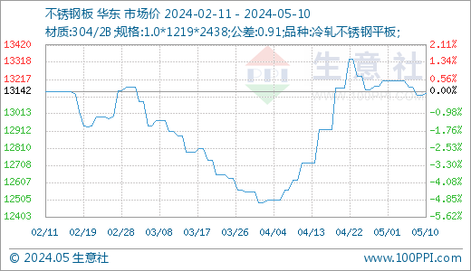 据生意社价格监测,本周不锈钢价格小幅下跌。截止5月10日,现货304/2B不锈钢平板1.0*1219*2438(公差0.91)的日均价为现报价13135.71元/吨,较周初下跌0.27%,同比下跌8%。