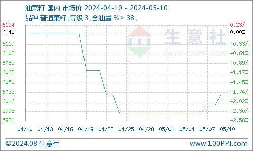 据生意社商品行情分析系统监测,五一节后,国产菜籽行情偏强走势,5月10日国产菜籽市场均价为6028元/吨,较五月初报价上涨0.53%。4月中下旬开始云南地区新菜籽陆续上市,5月初四川和湖北两地新菜籽也陆续上市,由于新菜籽质量不及预期,陈菜籽市场价格有小幅上涨。新菜籽上市初期,质量较差,加之各地菜籽品质差异较大,开称价格低于去年,市场观望情绪较重。由于湖北地区在前期遭受寒潮天气影响,菜籽产量有所下降,支撑国产菜籽行情上涨。五一期间,外盘美豆走势偏强,带动节后国内油脂油料市场行情走高,提振国内菜籽行情。随着新季菜籽陆续大量上市,下游采购节奏或将增加,预计国产菜籽走势或将偏强。