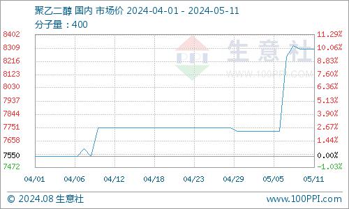 据生意社商品行情分析系统,截止到5月11日聚乙二醇400企业报价均价为8300.00元/吨,较周一价格相比,上涨7.44%。