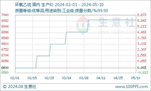 上游环氧乙烷:据生意社商品行情分析系统显示,5月10日,环氧乙烷参考价为7000.00,与5月1日持平,5月以来,上游环氧乙烷价格高位平稳运行,对聚乙二醇市场支撑稳定。