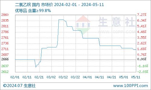 据生意社商品行情分析系统,周六国内二氯乙烷市场均价为2710元/吨,周一国内二氯乙烷市场均价为2716元/吨。本周二氯乙烷市场价格下跌0.25%。