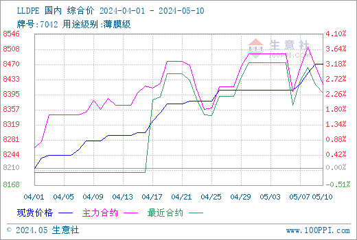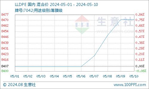 据生意社商品行情分析系统监测,LLDPE(7042)5月1日国内价格在8407元/吨,5月10日均价在8471元/吨,期间报价上涨幅度0.76%。