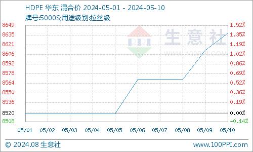 据生意社商品行情分析系统监测,HDPE(5000S)5月1日国内价格在8520元/吨,5月10日均价在8637元/吨,期间报价上涨1.38%。