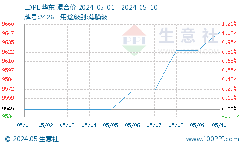 据生意社商品行情分析系统监测,LDPE(2426H)5月1日国内价格在9545元/吨,5月10日均价在9650元/吨,期间报价上涨幅度1.10%。
