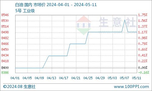 据生意社商品行情分析系统,截止5月11日白油市场均价在8500元/吨,5月4日白油市场均价在8500元/吨,价格波动后保持稳定。