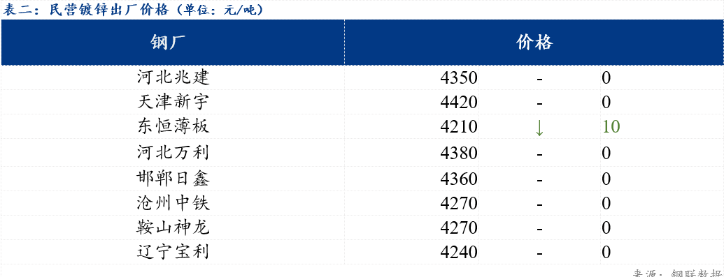 现北方地区民营镀锌板卷整体出厂价格在4210-4420元/吨。