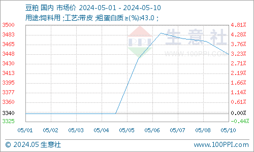 据生意社商品行情分析系统显示:五一过后,国内豆粕行情迎来大涨行情,涨势过后陆续回调,涨幅超3%。5月1日,豆粕市场均价3340元/吨,5月11日,豆粕市场均价3448元/吨,上涨3.23%。