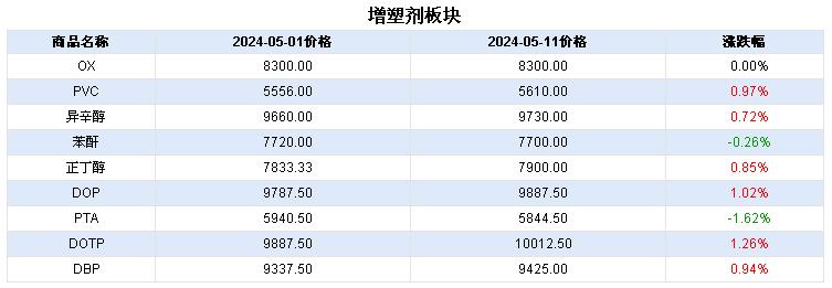 据生意社商品行情分析系统,5月主要增塑剂板块产品均出现小幅上涨,下游产品行情小幅回暖,增塑剂原材料辛醇、正丁醇价格上涨,主要增塑剂产品出现不同程度上涨。5月增塑剂板块总体小幅上涨。