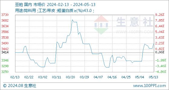 5月13日,生意社豆粕基准价为3448.00元/吨,与本月初(3340.00元/吨)相比,上涨了3.23%。
