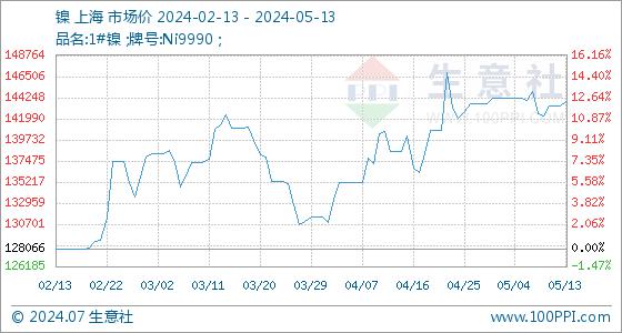 5月13日,生意社镍基准价为143375.00元/吨,与本月初(144166.67元/吨)相比,下降了-0.55%。