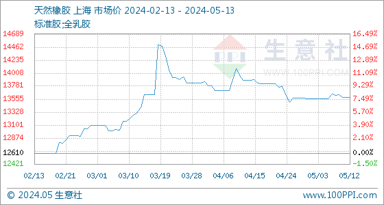 5月13日生意社天然橡胶基准价为13590.00元/吨