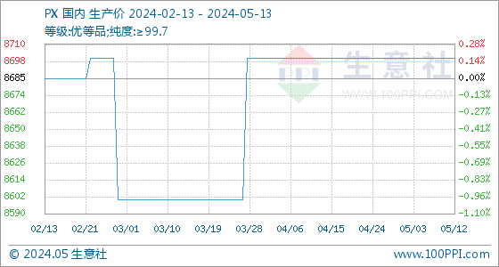 5月13日,生意社PX基准价为8700.00元/吨,与本月初持平。