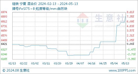 5月13日,生意社硅铁基准价为6797.14元/吨,与本月初(6464.29元/吨)相比,上涨了5.15%。