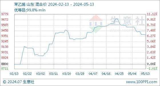 5月13日,生意社苯乙烯基准价为9380.00元/吨,与本月初(9530.00元/吨)相比,下降了-1.57%。