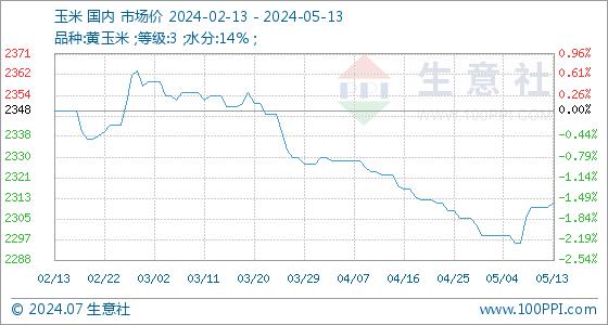 5月13日,生意社玉米基准价为2310.00元/吨,与本月初(2298.57元/吨)相比,上涨了0.50%。