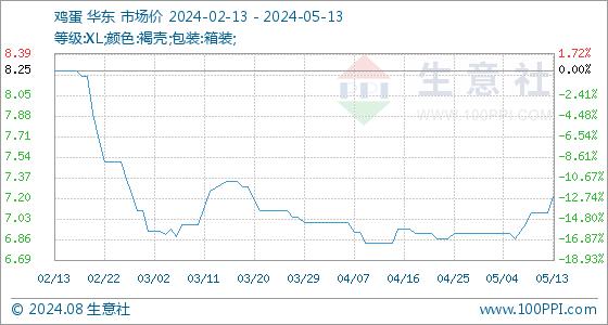 5月13日,生意社鸡蛋基准价为7.08元/公斤,与本月初(6.91元/公斤)相比,上涨了2.46%。
