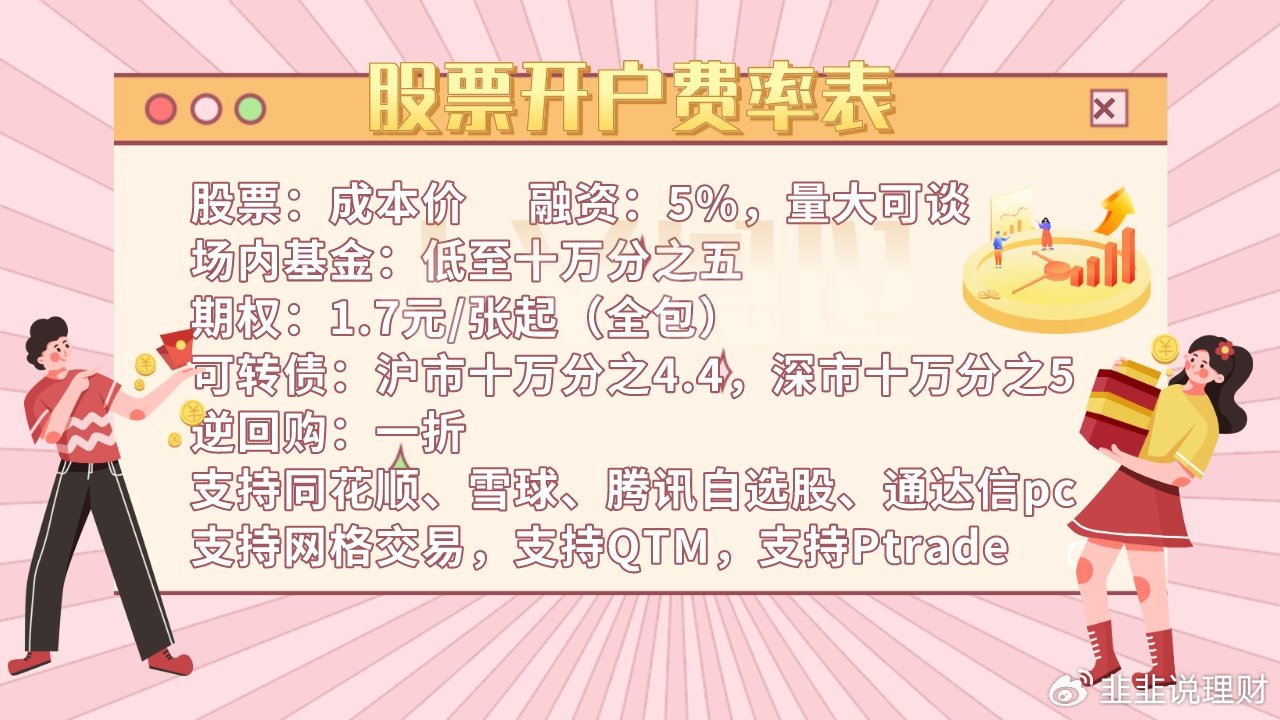 我司交易费率可以给您降成本价格,开户给您意想不到的成本价佣金,港股通十万分之八,我司融资专项利率低至5%,期权降低到1.7元/张!快速交易通道免费使用!并且支持QMT/Ptrade等量化交易软件!北交所万贰