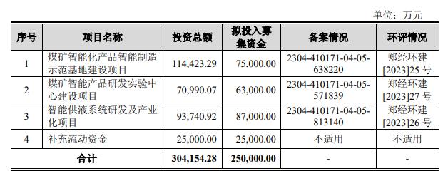 恒达智控拟公开发行股份不超过6,352.94万股,公司股东不公开发售股份,公开发行的新股不低于本次发行后总股本的10%。恒达智控原拟募集资金250,000.00万元,分别用于煤矿智能化产品智能制造示范基地建设项目、煤矿智能产品研发实验中心建设项目、智能供液系统研发及产业化项目、补充流动资金。