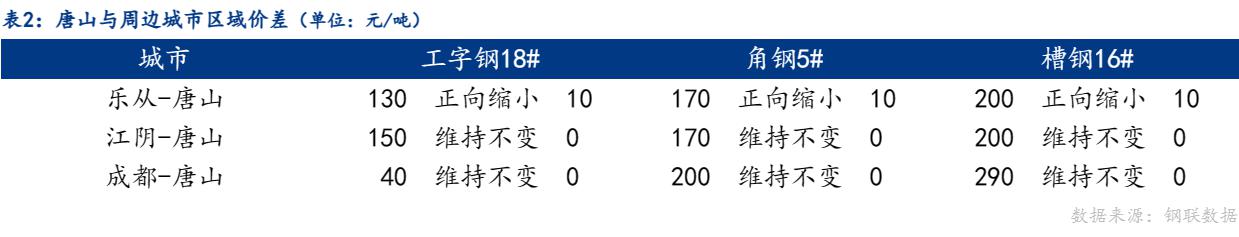 从区域价差来看,今日乐从工字钢、角钢、槽钢与唐山价差正向缩小;江阴工字钢、角钢、槽钢与唐山价差维持不变;成都工字钢、角钢、槽钢与唐山价差维持不变。