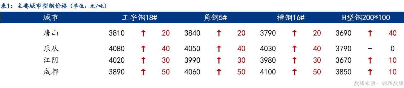 今日型钢价格趋强运行,唐山工字钢、角钢、槽钢价格较上一交易日上涨20元/吨 ,H型钢价格较上一交易日上涨40元/吨;乐从工字钢、角钢、槽钢价格较上一交易日上涨40元/吨,H型钢价格较上一交易日持平;江阴工字钢、角钢、槽钢价格较上一交易日上涨30元/吨,H型钢价格较上一交易日上涨10元/吨 ;成都工字钢、角钢、槽钢较上一交易日上涨50元/吨,H型钢价格较上一交易日上涨10元/吨。