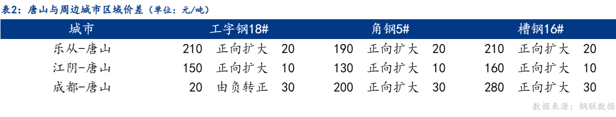 从区域价差来看,今日乐从工字钢、角钢、槽钢与唐山价差正向扩大;江阴工字钢、角钢、槽钢与唐山价差正向扩大;成都工字钢与唐山价差由负转正,角钢、槽钢与唐山价差正向扩大。