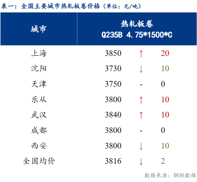 截止发稿时4.75热轧板卷全国均价3816元/吨,较上一交易日下跌2元/吨。其中主要城市价格为上海3850元/吨,沈阳3730元/吨,天津3750元/吨,乐从3800元/吨,武汉3840元/吨,成都3800元/吨,西安3800元/吨。
