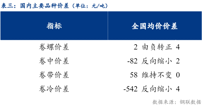 从品种价差来看,卷螺差较上一交易日有负转正4元/吨,热中价差较上一交易日反向缩小2元/吨,热带价差较上一交易日维持不变,热冷价差较上一交易日反向缩小4元/吨 。