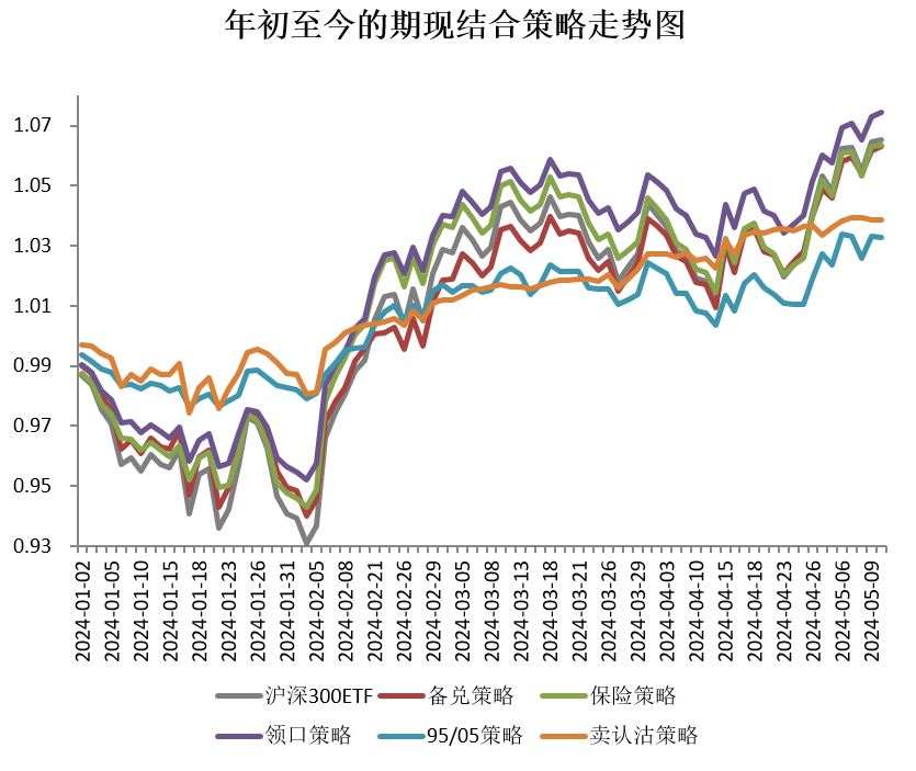 我们对期现结合的五个策略(备兑、保险、领口、95/05配置、卖认沽)及沪深300ETF现货,在2024.4.29-2024.5.10的表现进行了回测。期间沪深300ETF现货上涨,各期现结合策略均取得了正收益,其中保险策略买入的认沽期权已深度虚值,故保险策略走势与现货基本一致。具体结果如下: