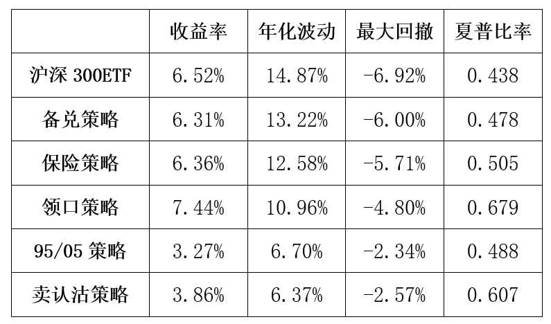 备兑、保险、领口策略建仓及调仓方法:组合基日为2023年1月3日,以收盘价买入1万份300ETF现货,备兑策略以收盘价备兑卖出开仓1张当月虚值5%的认购合约,保险策略以收盘价买入开仓1张当月虚值5%的认沽合约,领口策略以收盘价买入开仓1张当月虚值5%的认沽合约并备兑卖出开仓1张当月虚值5%的认购合约。此后在每个月期权合约到期日前一周的最后一个交易日进行调仓,以收盘价平仓已持有的期权合约,并以收盘价建仓相应的下月合约。ETF分红等事件出现时,使用获得的红利买入ETF进行再投资,保持期权合约对应的ETF份数和持有的ETF一致。旧合约仍持有到期,不向新挂牌合约展期。当保险策略和领口策略所持期权收益率超过50%时,期权进行止盈平仓。