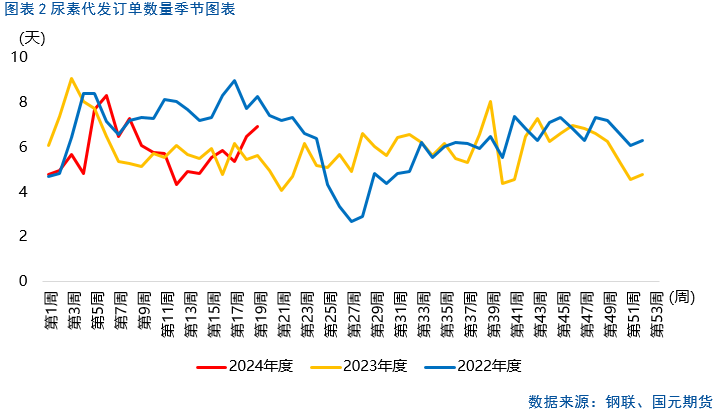 国内尿素仍有刚需跟进,工厂报价达到高位后维持坚挺,主要是前期预收订单支撑。农业上需求维持较高,局部地区水稻追肥补仓,玉米追肥备肥量偏少;工业上需求在短期内虽有波动,但有望维持高位,主要是高氮肥生产需求支撑,不过从季节性来看,中后期有下滑可能。截至5月10日,国内尿素企业代发订单天数为6.88万吨,环比增加6.34%。