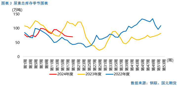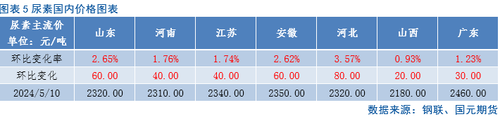 国内尿素库存再度录得下滑,但幅度有所收窄,市场情绪逐渐回归理性,港口库存下滑幅度明显。截至5月10日,国内尿素总库存为69.78万吨,环比减少1.62%;其中尿素港口库存为19.5万吨,环比减少2.99%,尤其是小颗粒尿素港口库存量环比下滑5.33%;尿素厂内库存为50.28万吨,环比减少1.08%。不过,国内尿素现货价格偏高,我们认为后期尿素市场情绪将或将谨慎,甚至对去库形成拖累。