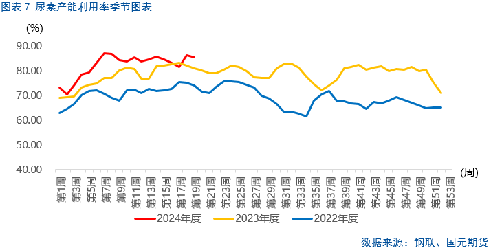 国内尿素供应下滑,这也是支撑尿素上涨的重要因素之一。上周有部分企业意外检修1至3天不等,不过均在5月10日前恢复;此外,前期提及的企业检修计划正按部就班进行中,涉及产能约200万吨/年,持续时间在1至2周不等,于5月16日起逐步恢复;后续仍有企业存检修计划,因此预计尿素产量将持续收缩。截至5月10日,国内尿素产能利用率为85.52%,环比减少0.83个百分点,其中煤制尿素产能利用率为87.24%,环比减少1.35,气制尿素产能利用率为80.21%,环比增加0.75个百分点。此外,国内尿素周度产量为129.63万吨,环比减少0.96%,其中煤制尿素产量为14.26万吨,环比减少1.52%,气制尿素产量为29.81万吨,环比增加0.95%。