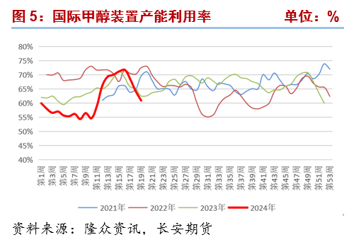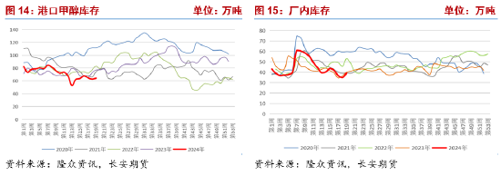 5月10日当周,甲醇下游厂家库存15.94万吨,环比降2.08万吨,假期下游以消耗库存为主,但当前库存仍处历史同期中等偏高水平,下游补库意愿并不迫切。