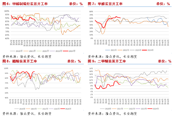 近期甲醇价格不断上涨,下游跟进不足,当前下游装置盈利性相对不佳,不排除后续装置有降负或停车动作。上一统计期内华东地区甲醇制烯烃装置生产毛利-1716元/吨,目前甲醇制烯烃装置亏损幅度远超其他制法装置,不排除有外采丙烯或PDH制法开工率上行可能。甲醛装置毛利-30元/吨,亏损有所收窄,二甲醚装置微盈,醋酸装置盈利上行。