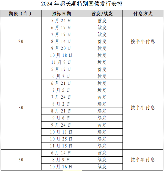 根据此次发布的通知,今年超长期特别国债的期限品种包括20年期、30年期、50年期,将从5月17日首发到11月中旬发行完毕,一共发行22次。