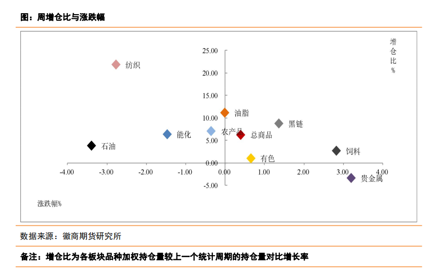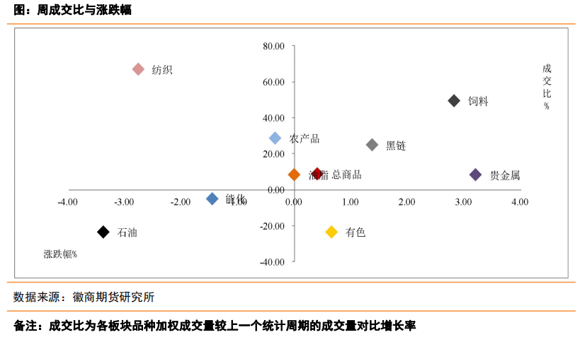 其他板块涨跌幅如下,饲料指数上涨 2.829%,油脂指数上涨 0.002%,黑链指数上 涨 1.372%,纺织指数下跌 2.761%,有色指数上涨 0.661%,农产品指数下跌 0.344%, 能化指数下跌 1.464%。