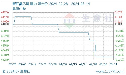 一、价格走势:5月14日,PTFE市场持稳运行。据生意社监测系统显示,截至5月14日,ptfe悬浮中粒市场价格维持在35000-50000元/吨左右。
