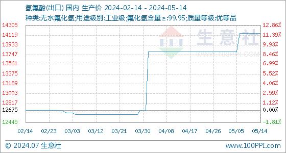 二、影响因素:成本价格高位承压,生产企业利薄。据生意社数据监测系统显示,截止5月14日,生意社氢氟酸(出口)基准价为14150.00元/吨,与本月初(13800.00元/吨)相比,上涨了2.54%。